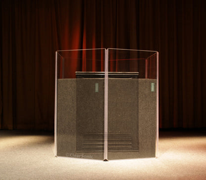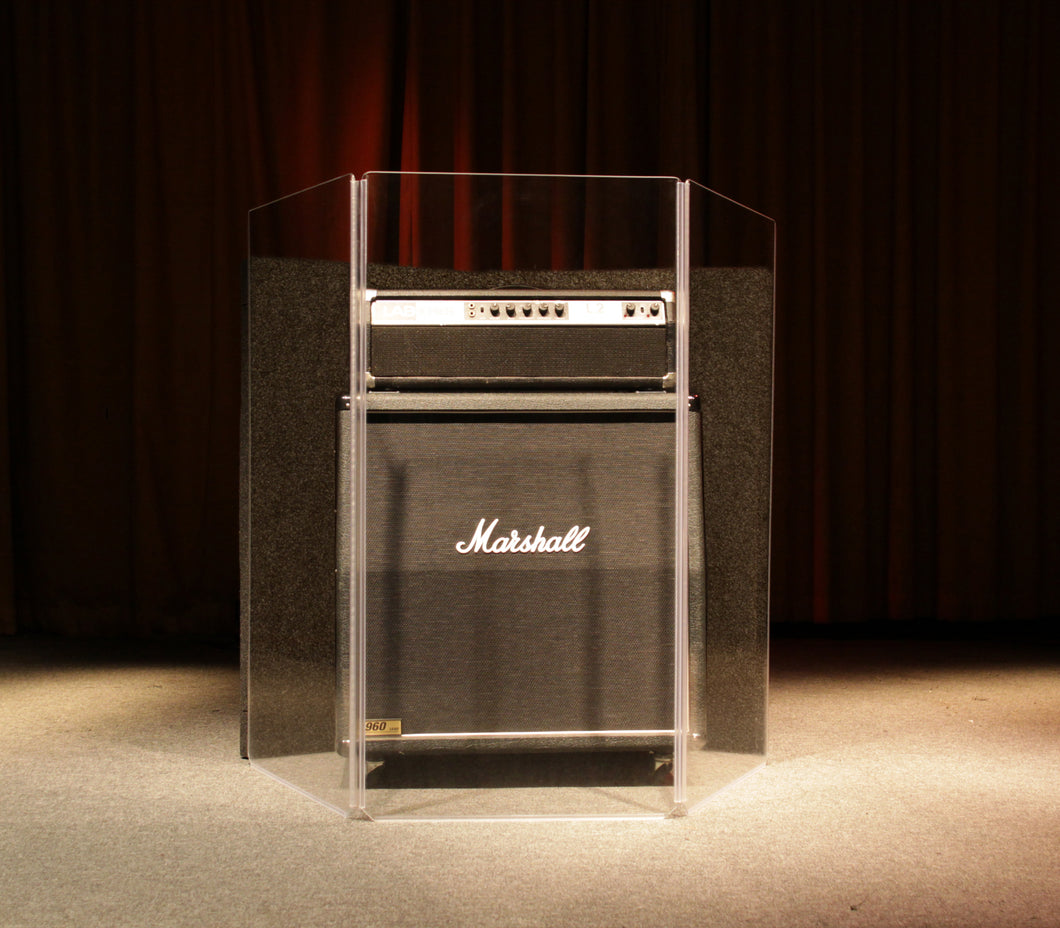 ¼” thick acrylic material – provides durability for transporting panels. Creates acoustic separation between instruments on stage or in the studio to cut down on mic bleeding and allows everyone to hear themselves and the mix better. Adds stability that allows for modular set up to support acrylic height extenders and Sorber baffles on top, such as a LidPac, and attachment of Sorber panels, such as the S2224, directly to the acrylic panels with adhesive-backed Velcro.